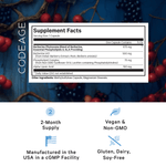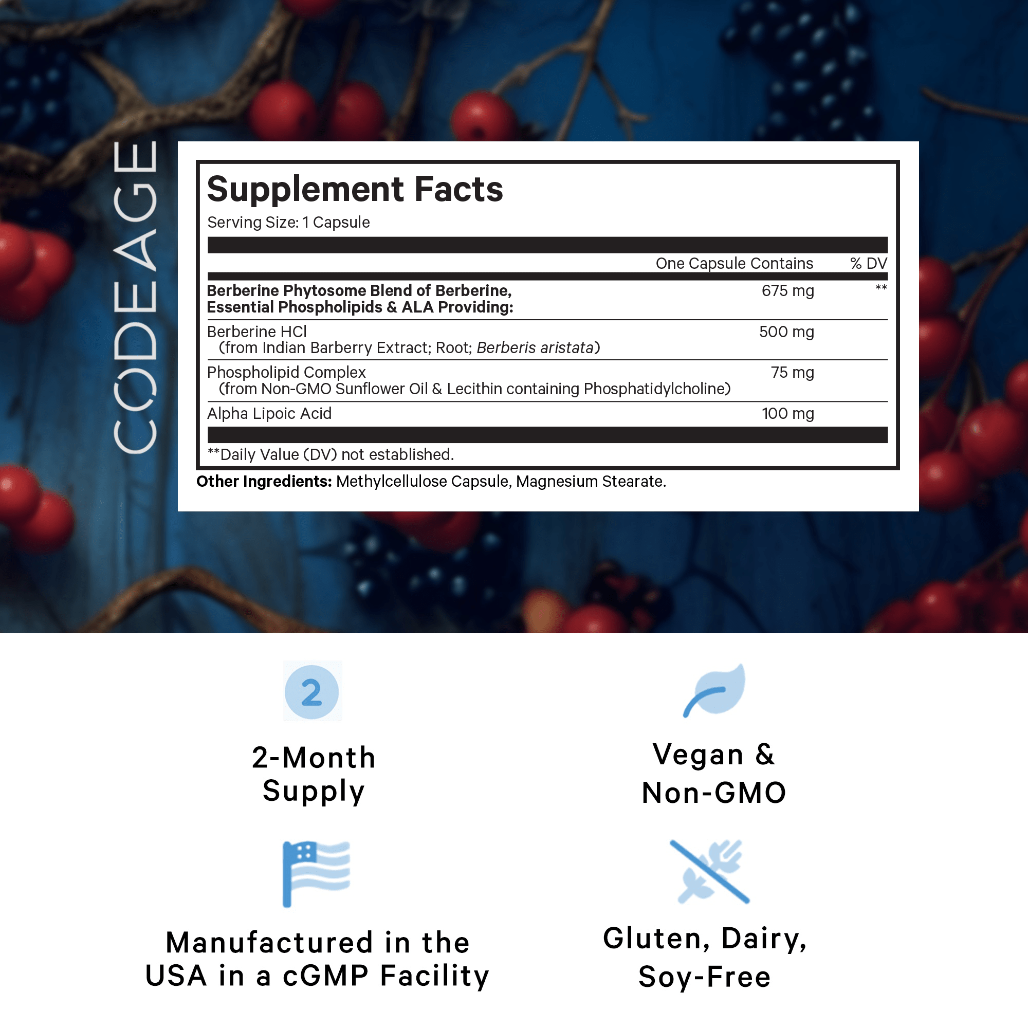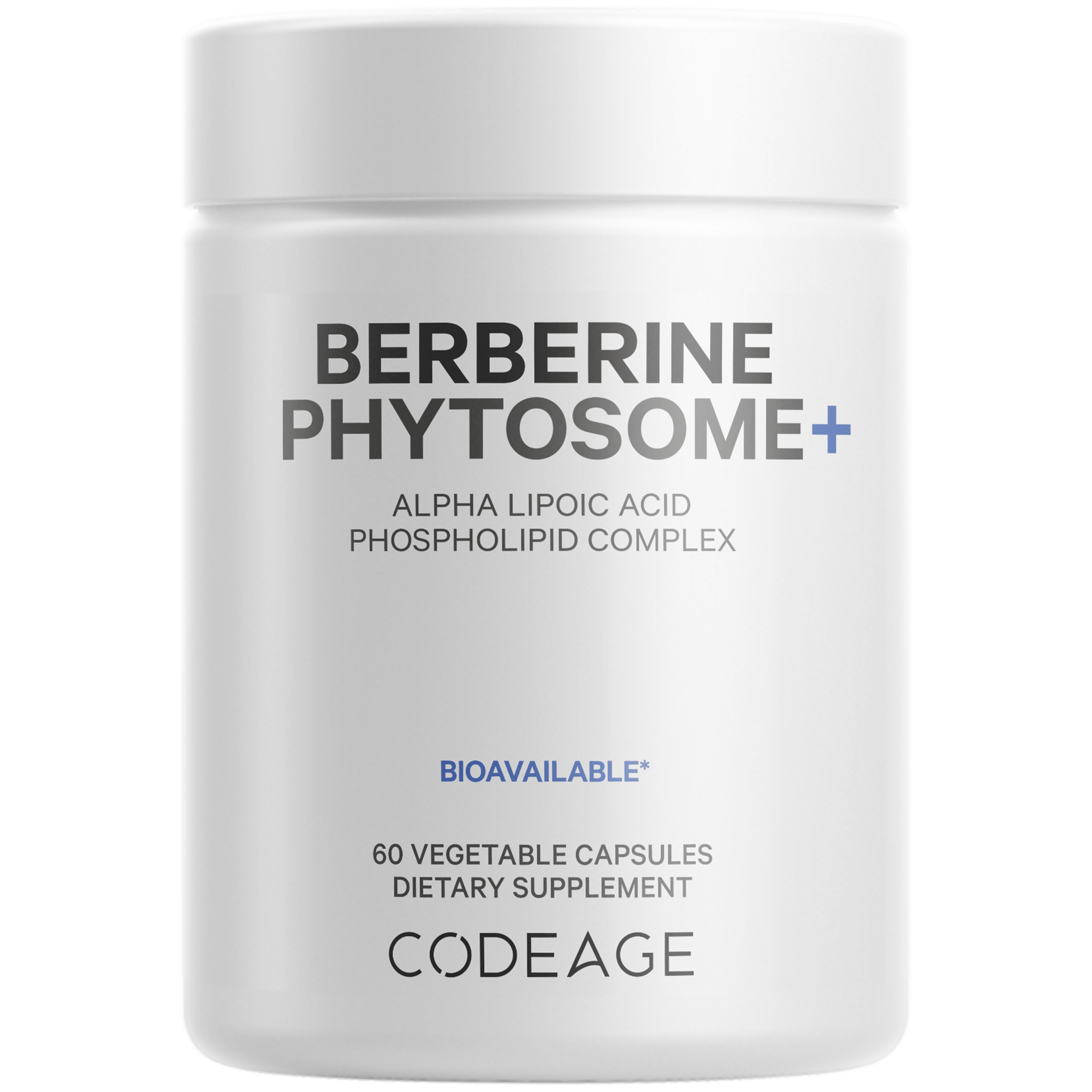 WELL-ROUNDED SUPPLEMENT Codeage Berberine Phytosome+ supplement features Berberine HCL derived from Indian Barberry extract and Alpha Lipoic Acid. This formula also includes a phospholipid complex. Each bottle provides a 2-month supply. โ€ข Codeage Berberine Phytosome+ offers Berberine HCL sourced from Indian Barberry extract (Berberis aristata), a bioactive compound extracted from various plants. โ€ข This supplement also includes Alpha Lipoic Acid, which complements the formula, alongside Berberine. โ€ข The formula features a phospholipid complex from non-GMO sunflower oil and lecithin. โ€ข This Berberine HCL 500mg supplement provides 60 servings per bottle, with one capsule per serving for convenient daily use. โ€ข Codeage Berberine Phytosome+ is non-GMO, vegan, and free from dairy, soy, and gluten. It is manufactured in the USA with globally sourced ingredients in a cGMP-certified facility for quality and purity. โ€ข These statements have not been evaluated by the Food and Drug Administration. This product is not intended to diagnose, treat, cure, or prevent any disease.
