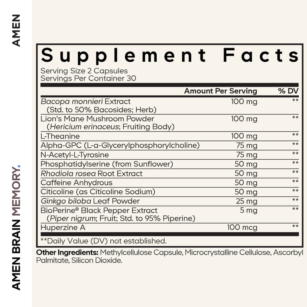 The ingredients in Codeage Amen Brain Memory are chosen to align with general brain wellness goals, including focus, mental performance, and memory support. Rather than relying on aggressive stimulants or short-term effects, the formula emphasizes daily nutritional support intended for ongoing use.