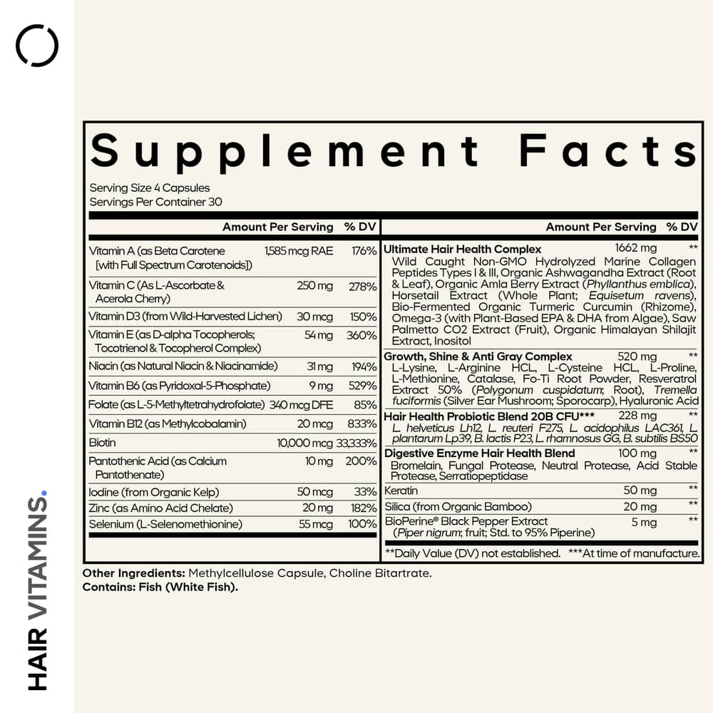 Plant-based EPA and DHA from algae, resveratrol, silver ear mushroom, and a botanical blend of organic ashwagandha, amla berry, turmeric curcumin, and saw palmetto provide antioxidant and growth-supportive benefits for hair.*