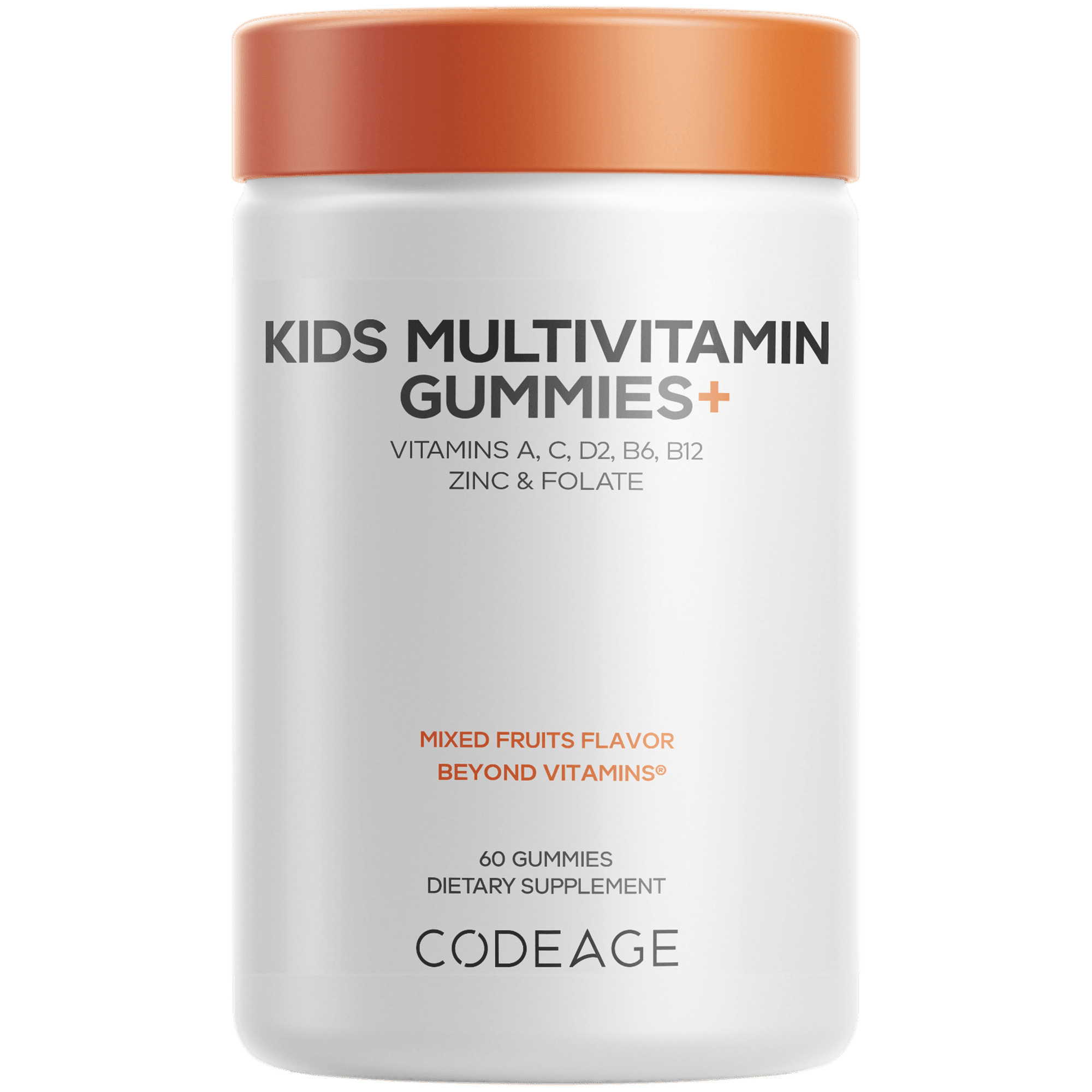 Codeage Kids Multivitamin Gummies+ provides a complete blend of essential vitamins and minerals including Vitamins A, C, D2, B6, B12, zinc, iodine, folate, and pantothenic acid to support overall growth and wellness.