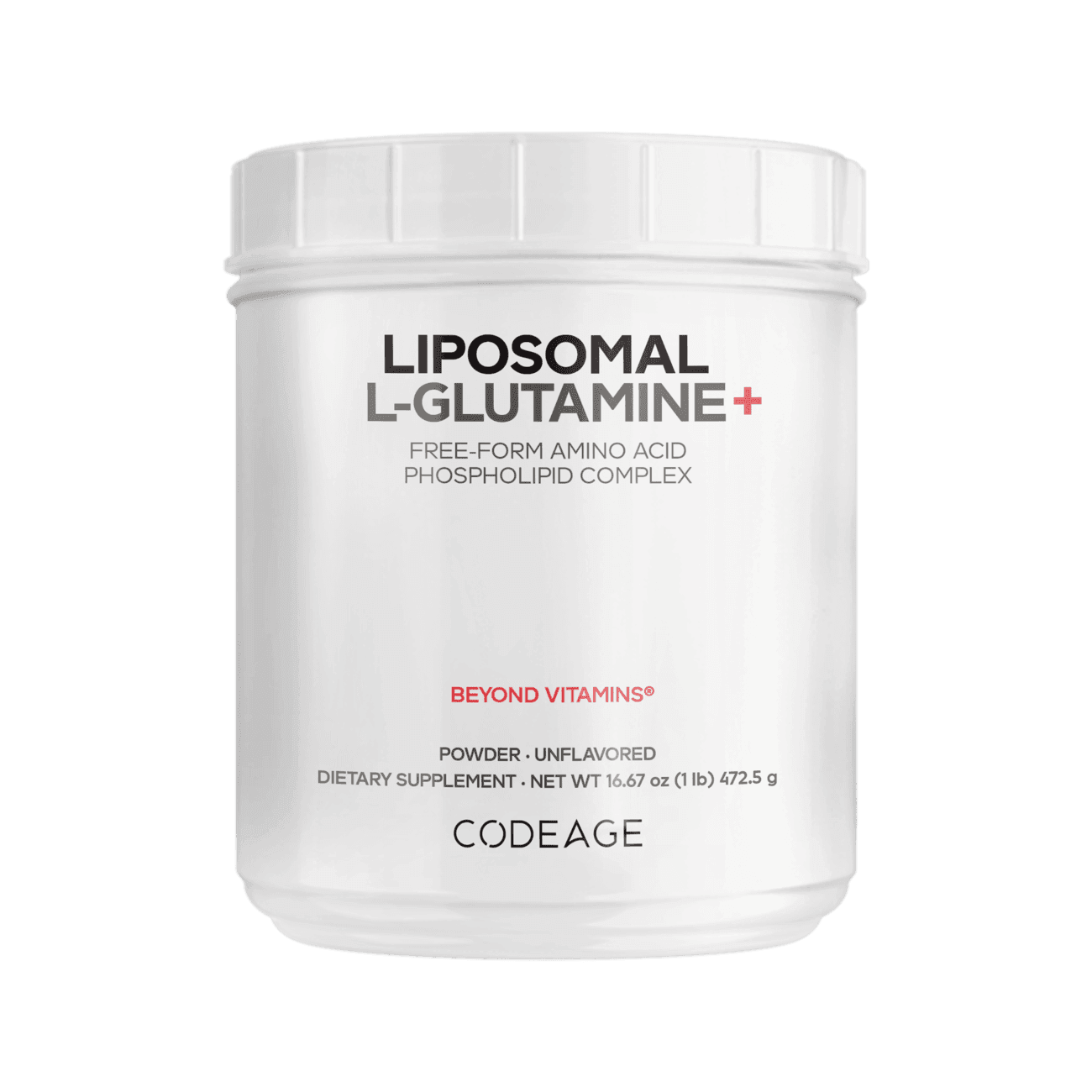 Codeage Liposomal L-Glutamine provides 5000mg of free-form L-glutamine per serving in a high-quality powder formula with advanced liposomal delivery to support absorption and bioavailability.*