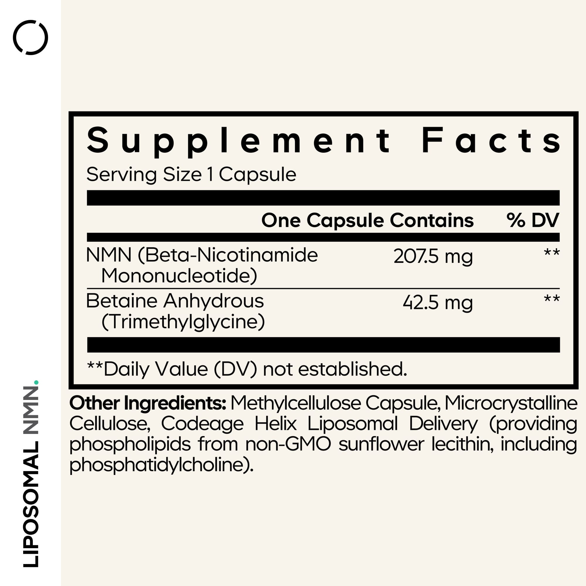 In addition to NMN, the supplement includes betaine anhydrous, also known as trimethylglycine (TMG). Betaine supports healthy methylation pathways and contributes to maintaining optimal homocysteine levels, which plays a role in metabolic and cardiovascular health. By helping facilitate methyl donor activity, betaine complements NMNโs role in NAD+ metabolism and cellular processes.