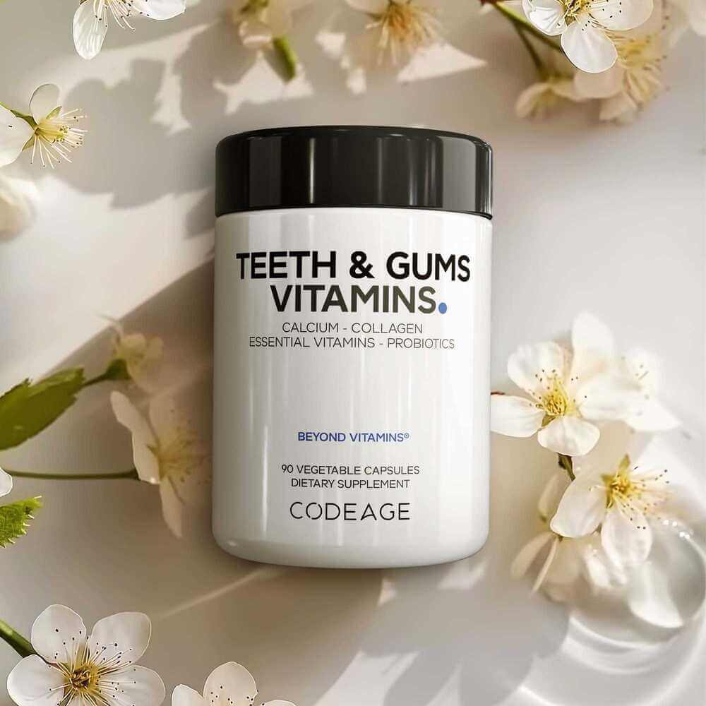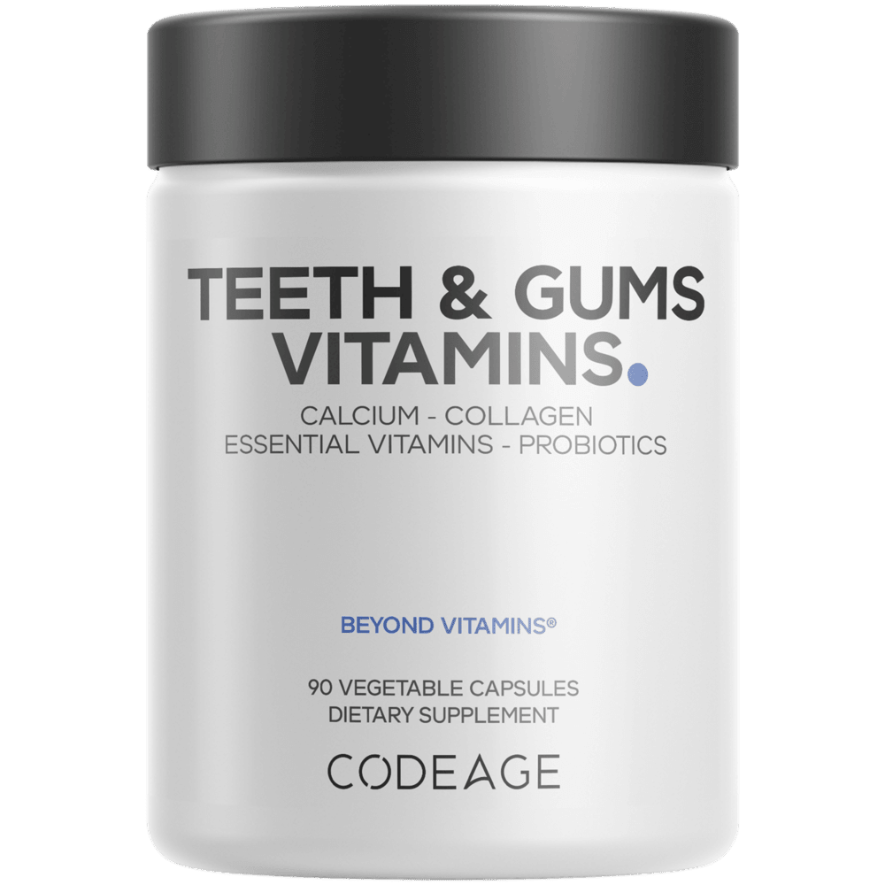 Codeage Teeth & Gums supplement delivers essential vitamins A, C, D3, and K2, along with minerals, oral care probiotics, and whole-food calcium to support strong teeth and healthy gums.*