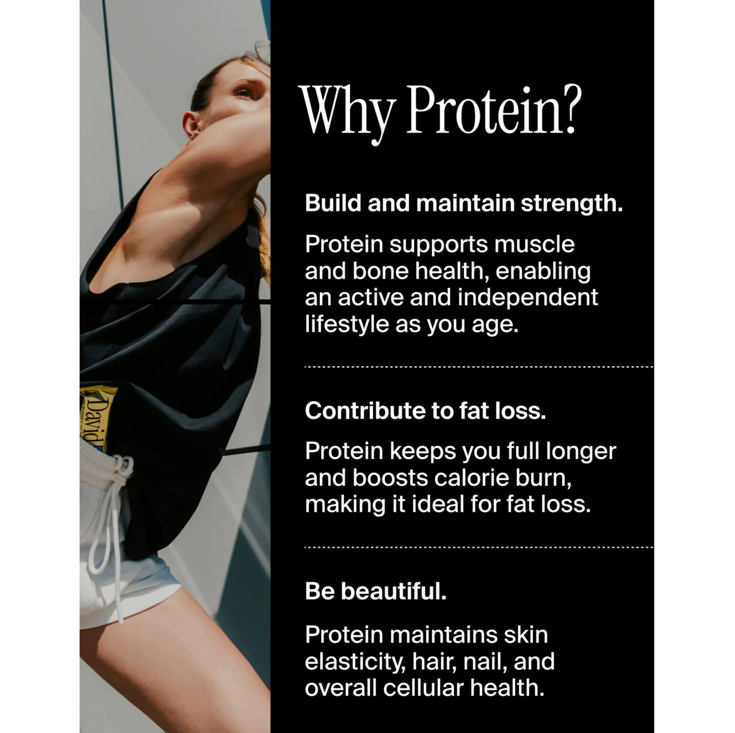 David has 28g of protein and only 150 calories. This is 75% CFP (CFP = Calories from Protein / Total Calories). The most protein-dense bar in existence. A diversity of protein sources comes together for a perfect 1.0 protein digestibility-corrected amino acid score (PDCAAS), meaning this protein is the best amino acid profile for both muscle building and optimal bodily functioning (including skin, hair, and nail health).