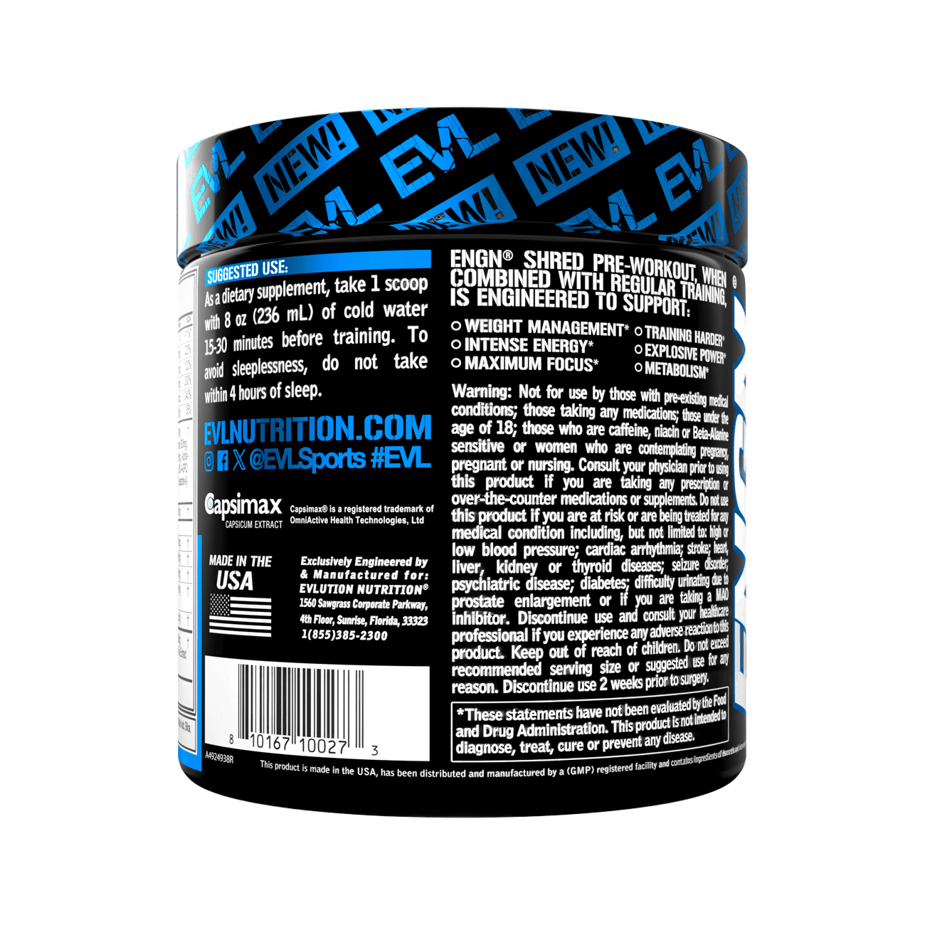 ENGN Shred Pre Workout is built for people who want high energy training support while also focusing on fat loss and lean muscle definition. This thermogenic pre workout combines performance ingredients with metabolism support, making it a strong option for cutting phases, fasted cardio sessions, or high intensity training days. It is designed to help increase workout intensity while supporting calorie burning and mental focus.