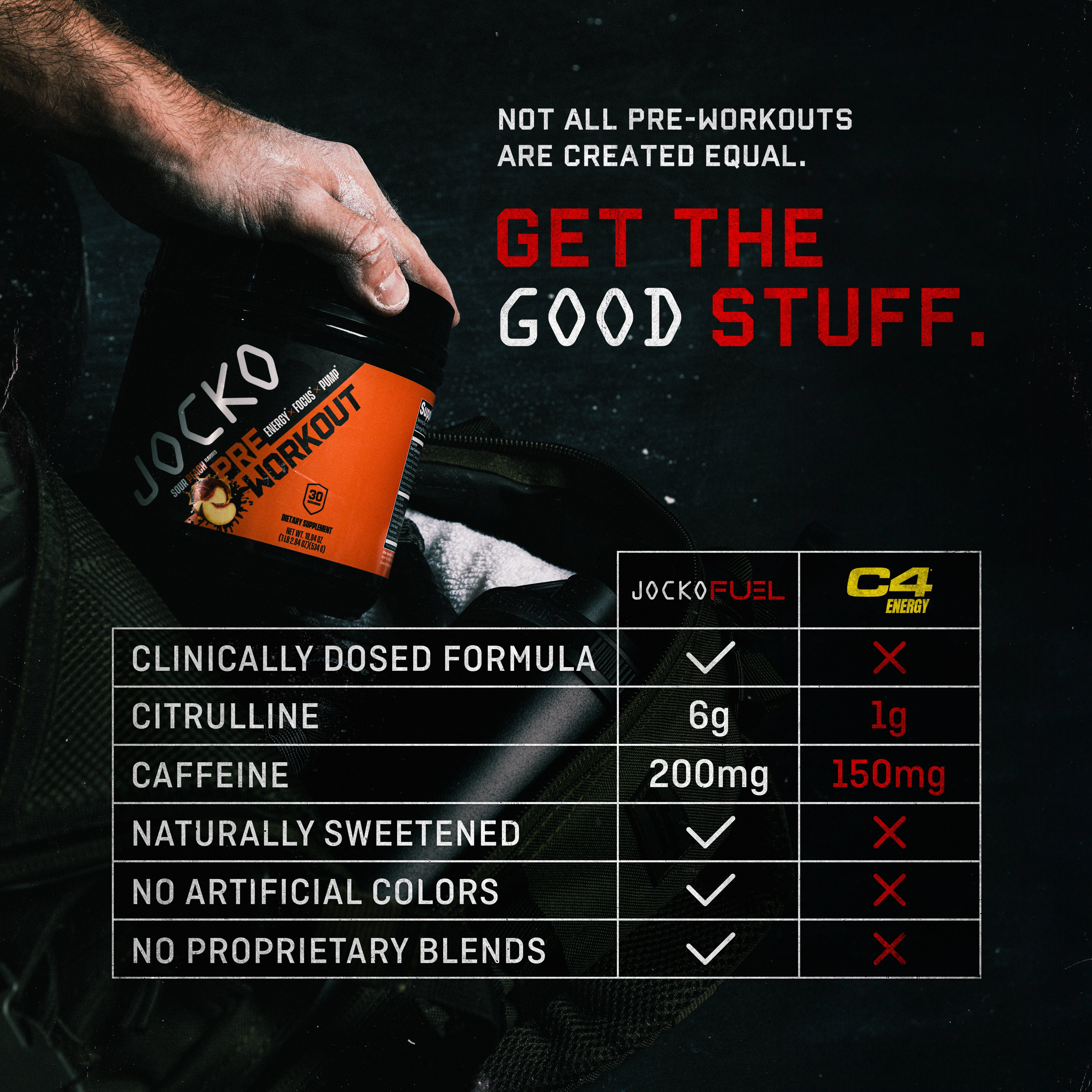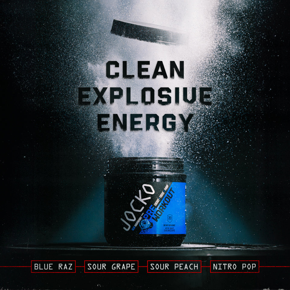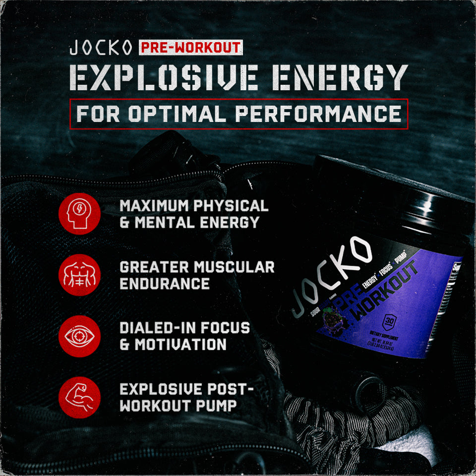 Get your mind and body dialed in with high-stim Jocko Pre-Workout. Made with fully-dosed, clinically-studied ingredients, our formula supports explosive energy (200mg of caffeine), increased blood flow, cognitive sharpness, and muscle pump to power through even the most challenging workouts.