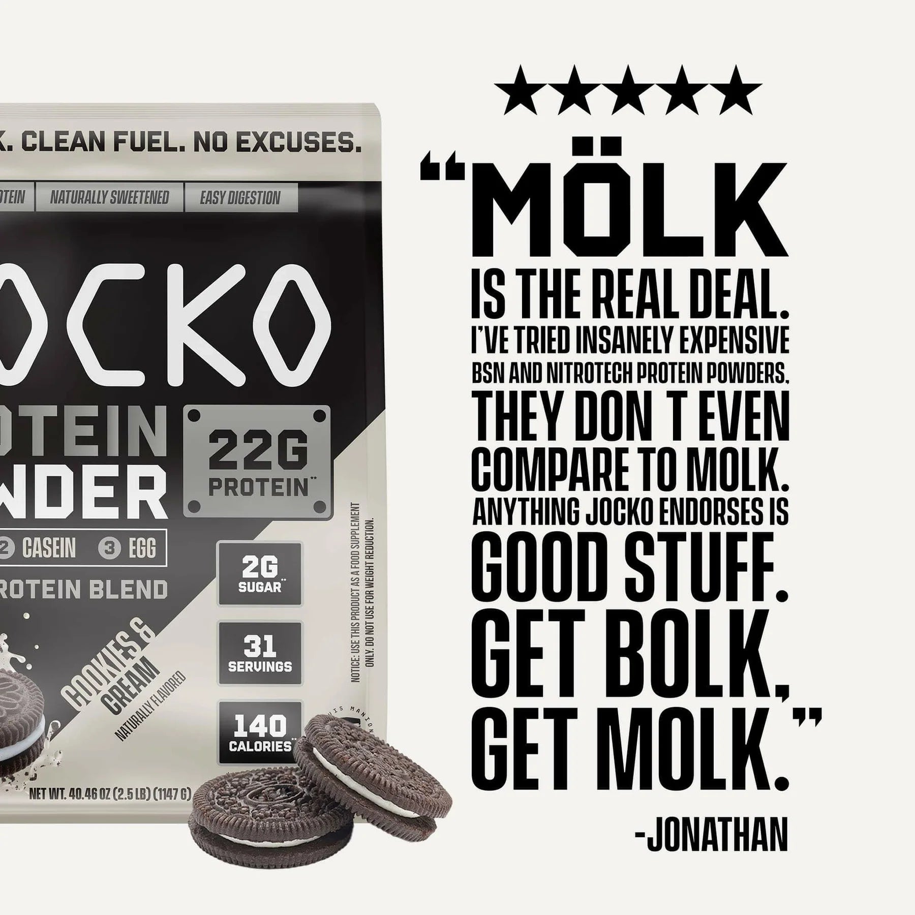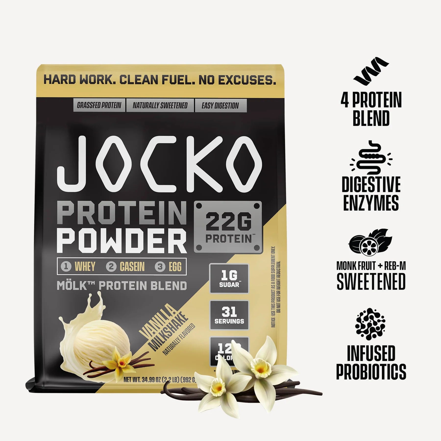 JOCKO Mölk is built around a multi-source protein blend that includes whey concentrate, whey isolate, micellar casein, and egg protein. This combination creates a time-release effect, delivering both fast and slow-digesting protein to your muscles over several hours.