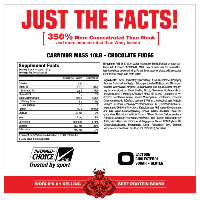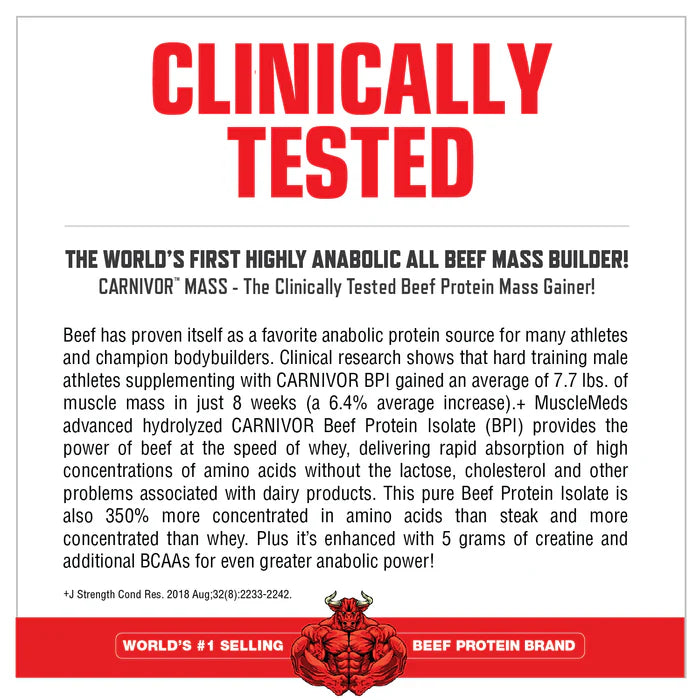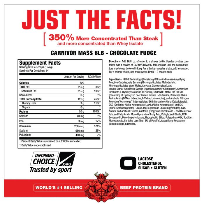 CARNIVOR MASS is commonly referred to as โ€œanabolic superfoodโ€ and is more advanced than the typical mass gainer. Where regular foods and typical gainers may be limited in terms of speed of absorption and the potential for insulin spiking, CARNIVOR MASS excels. It combines a unique hydrolyzed Beef Protein Isolate (BPI) with a dual-action insulin signal amplifying technology known as iSpike. The combination of BPI and iSpike act in tandem to support improved muscle anabolism while minimizing fat storage. CARNIVOR MASS is a fast, clean and highly anabolic gainer. Welcome to a new era in mass building supplementation with CARNIVOR MASS, the fast, clean, highly anabolic mass gainer!