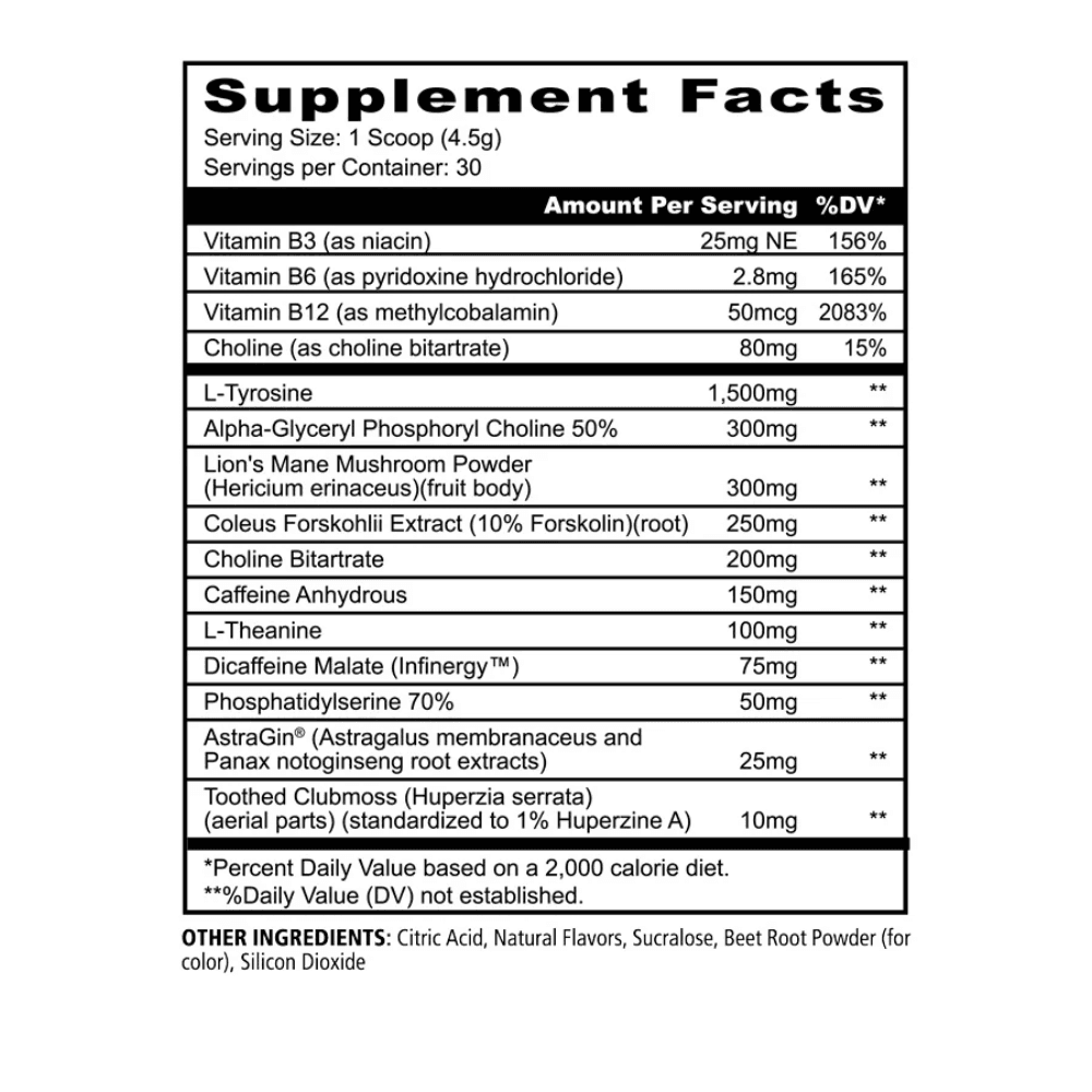 This formula includes ingredients such as lionโs mane mushroom extract, Lโtyrosine, caffeine anhydrous, and toothed clubmoss extract to help provide both immediate and sustained support for brain function. Lionโs mane has associations with longโterm brain health and focus pathways, while Lโtyrosine helps support neurotransmitter production linked with mental performance under stress or during demanding tasks. Caffeine helps deliver a clean energy boost, and botanical extracts help reinforce antioxidant protection and cognitive resilience throughout the day.