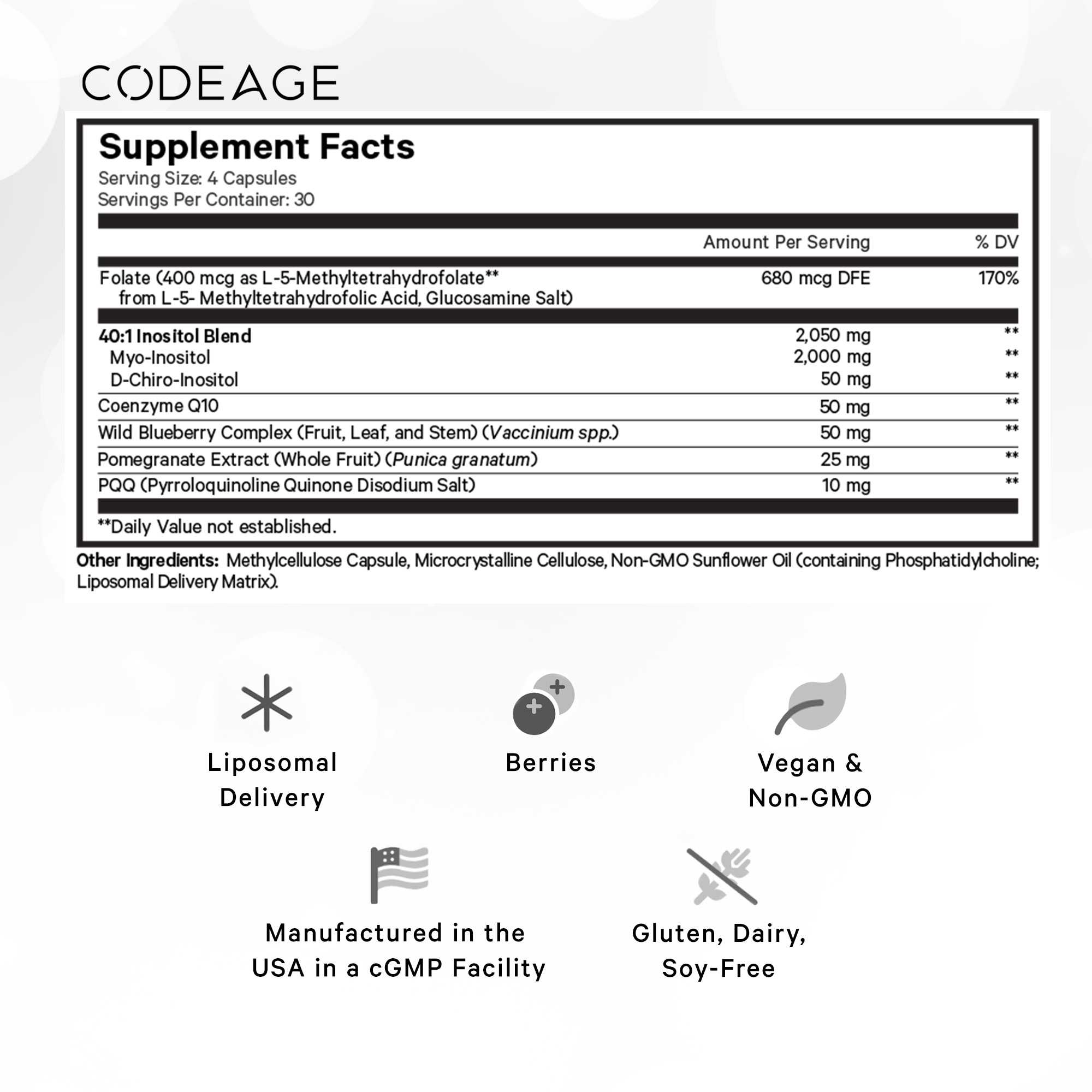 Folate (400 mcg as L-5-Methyltetrahydrofolate** from L-5-Methyltetrahydrofolic Acid, Glucosamine Salt), 40:1 Inositol Blend: Myo-Inositol, D-Chiro-Inositol, Coenzyme Q10 Phytosome (Coenzyme Q10 / Phospholipid Complex from Sunflower), Wild Blueberry Complex (Fruit, Leaf, and Stem) (Vaccinium spp.), Pomegranate Extract (Whole Fruit) (Punica granatum), PQQ (Pyrroloquinoline Quinone Disodium Salt).