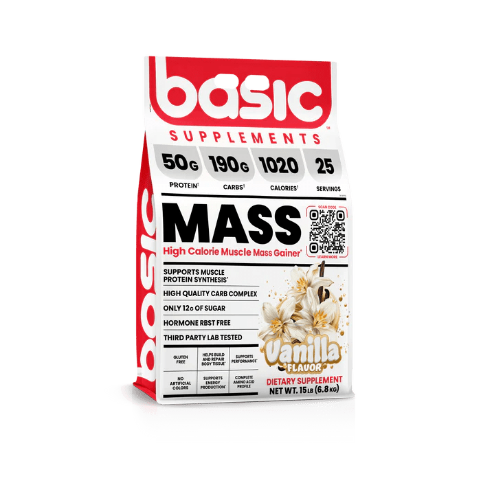 Achieve your muscle-building goals with Basic Supplements Mass, a high-calorie muscle mass gainer designed to support muscle protein synthesis*. Each serving delivers 50 g of RBST hormone-free whey protein, complete amino acid profile, and high-quality carb complex, offering the ideal blend for your bulking regimen. Formulated to provide the necessary calories and nutrients for muscle growth without compromising quality, Basic Mass is perfect for elite athletes and fitness newcomers alike. Our premium mass gainer helps build lean muscle and boost your endurance efficiently*.