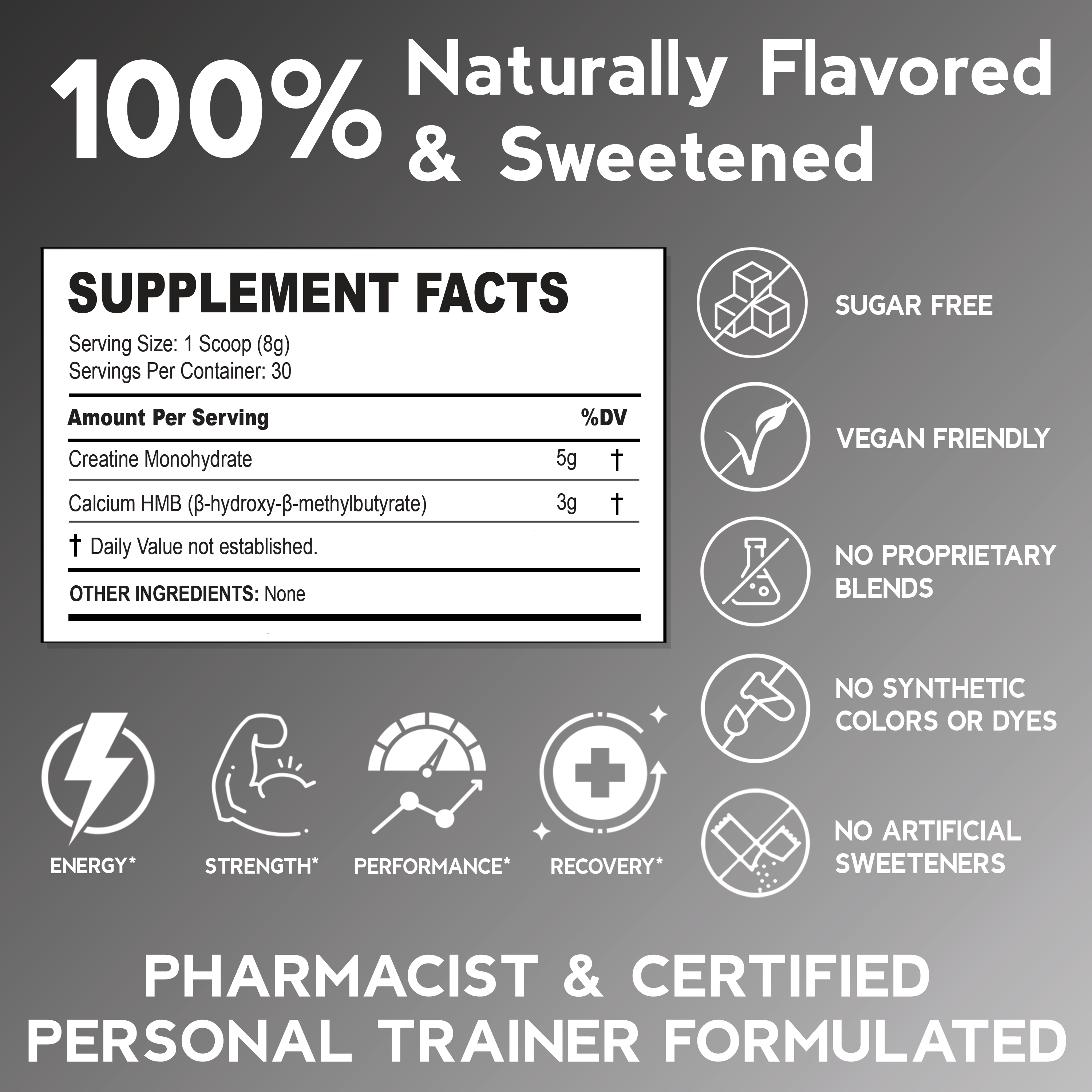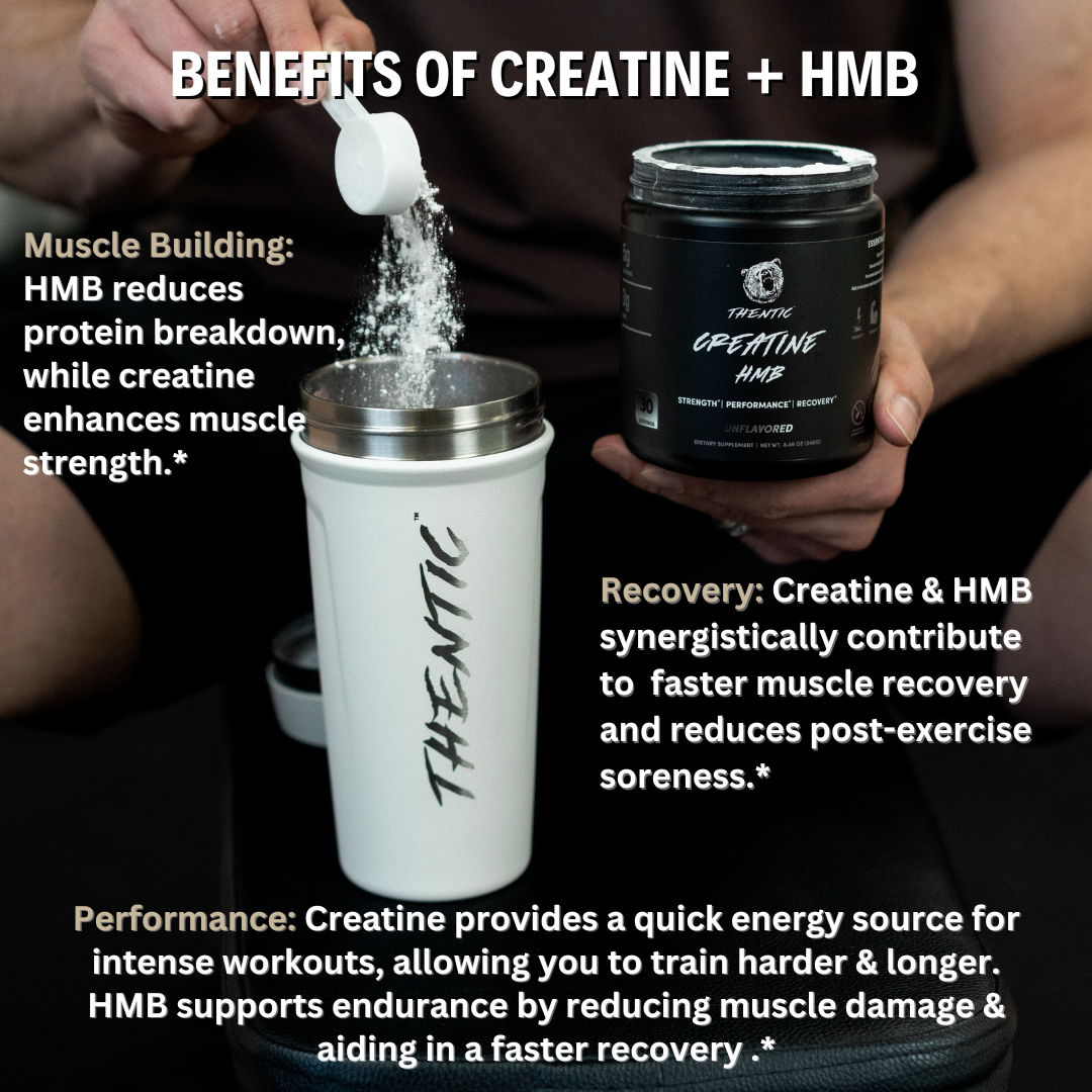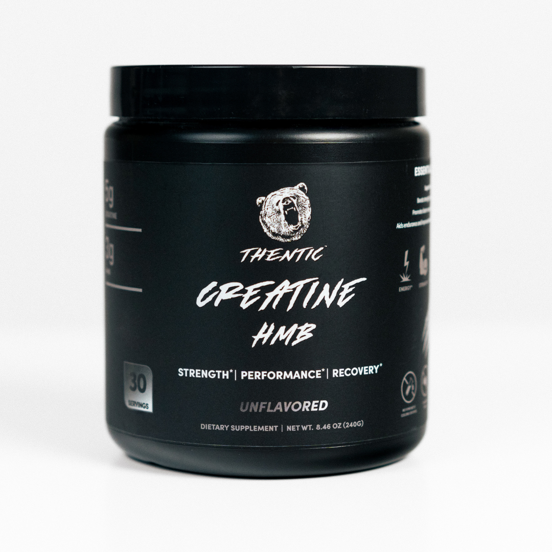 Thentic's Creatine Monohydrate + HMB features 5,000 mg of pure creatine monohydrate plus 3,000mg of HMB. Creatine Monohydrate remains the gold standard of creatine supplements, with hundreds of studies proving its effectiveness in athletes, fitness enthusiast, and gym-goers alike. Our Creatine + HMB mixes easily in virtually any liquid and can be stacked with your favorite powder supplements, such as pre-workout, BCAAs and electrolytes.